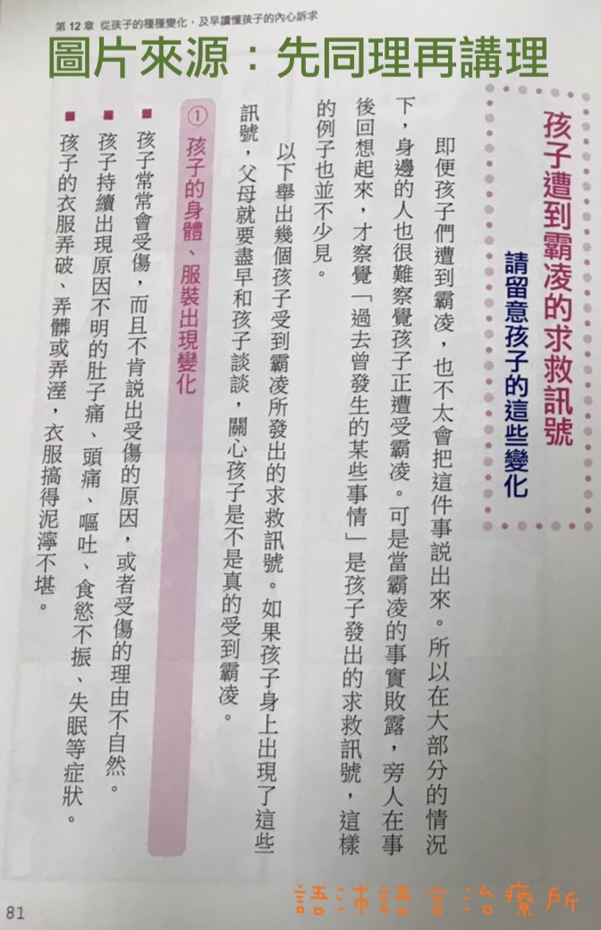 書上羿潔老師覺得很實用的地方就是第12章有列出孩子的求救訊號,如果家長跟老師能夠及早發現的話,可能就能阻止校園霸凌事件出現
